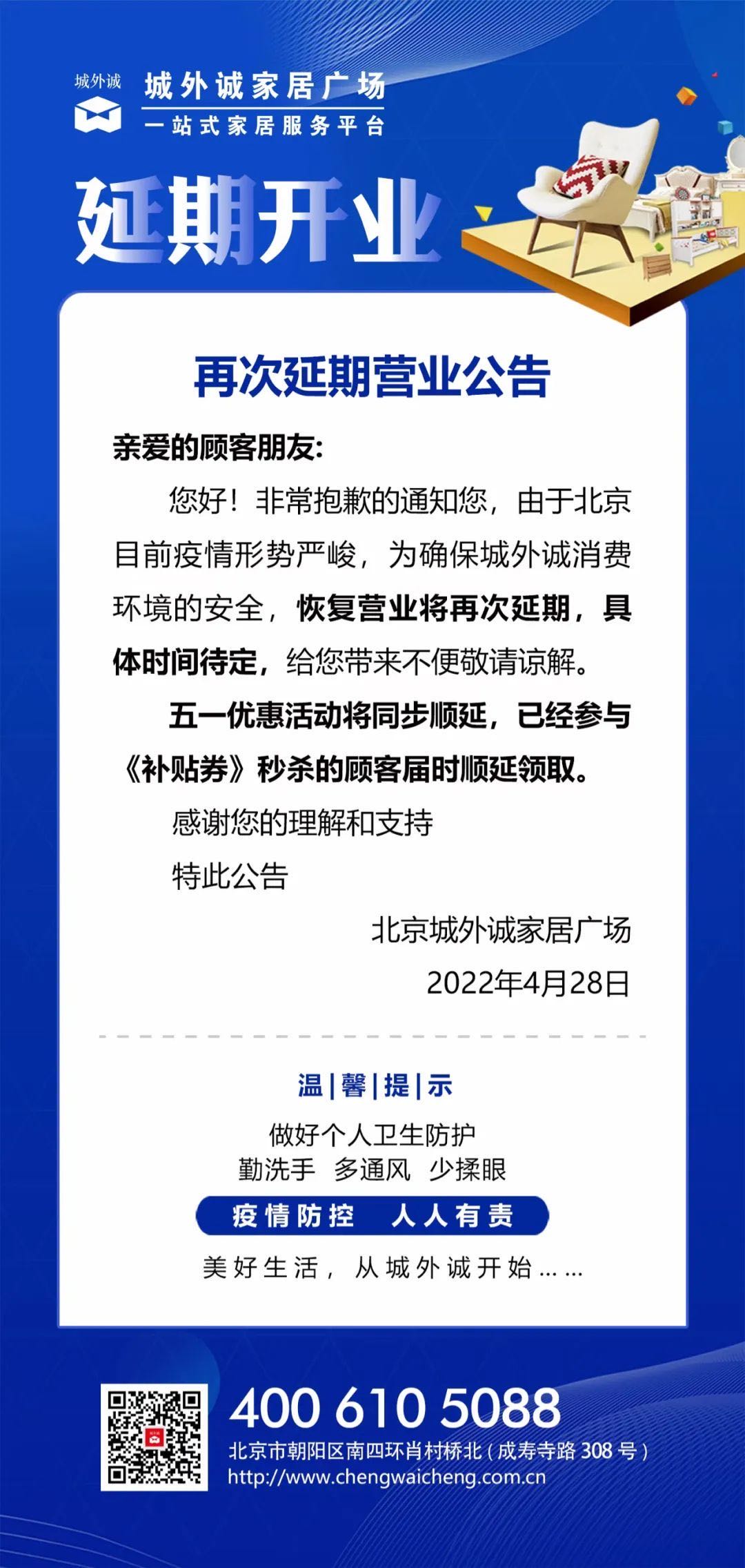 新京报讯(记者张洁)4月28日晚,北京城外诚家居广场发布通知,为确保城外诚消费环境的安全,将再次延期恢复营业,具体时间待定。