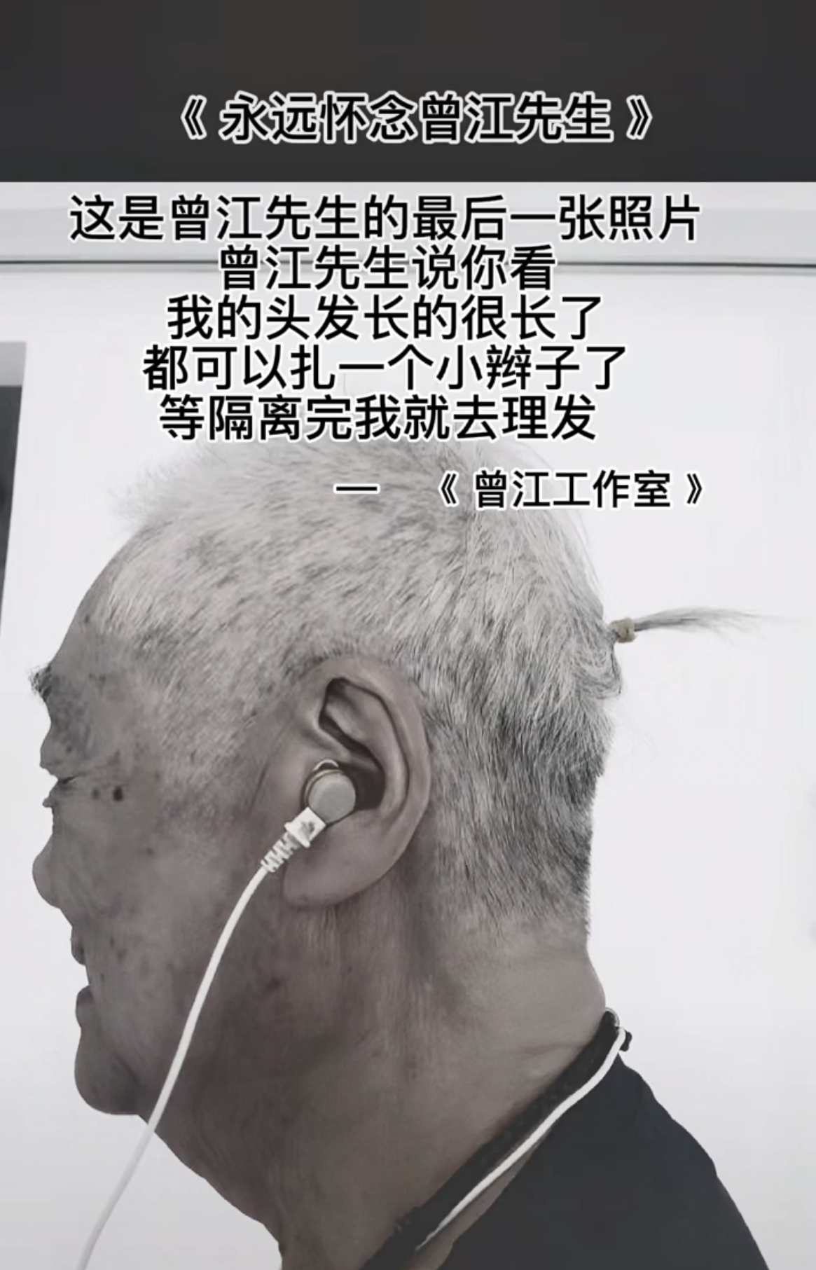 新京报讯 4月28日晚,认证为曾江工作室的短视频平台账号发布了曾江生前最后一张照片。照片中曾江扎了一个辫子,配文中透露,这是曾江的最后一张照片,他说“你看,我的头发长得很长了,都可以扎小辫子了。”