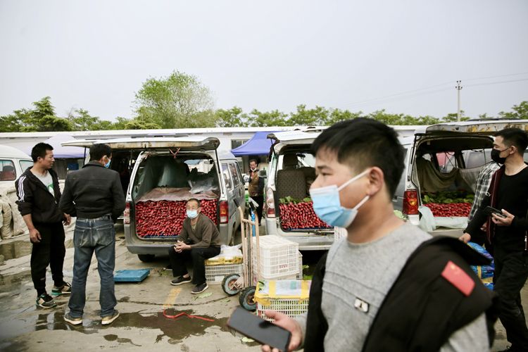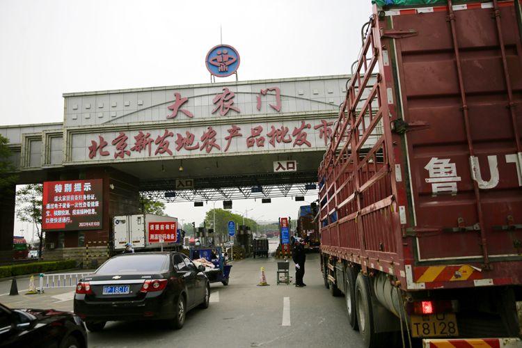 4月29日,新发地市场大农门,保安查验货车司机的健康码、48小时内核酸检测阴性证明等。