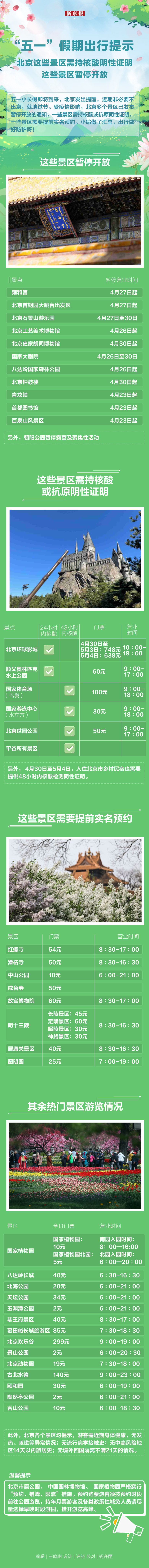 五一小长假即将到来,北京发出提醒,近期非必要不出京,就地过节。受疫情影响,北京多个景区已发布暂停开放的通知,一些景区需持核酸或抗原阴性证明,一些景区需要提前实名预约。小编做了汇总,出行做好防护呀!