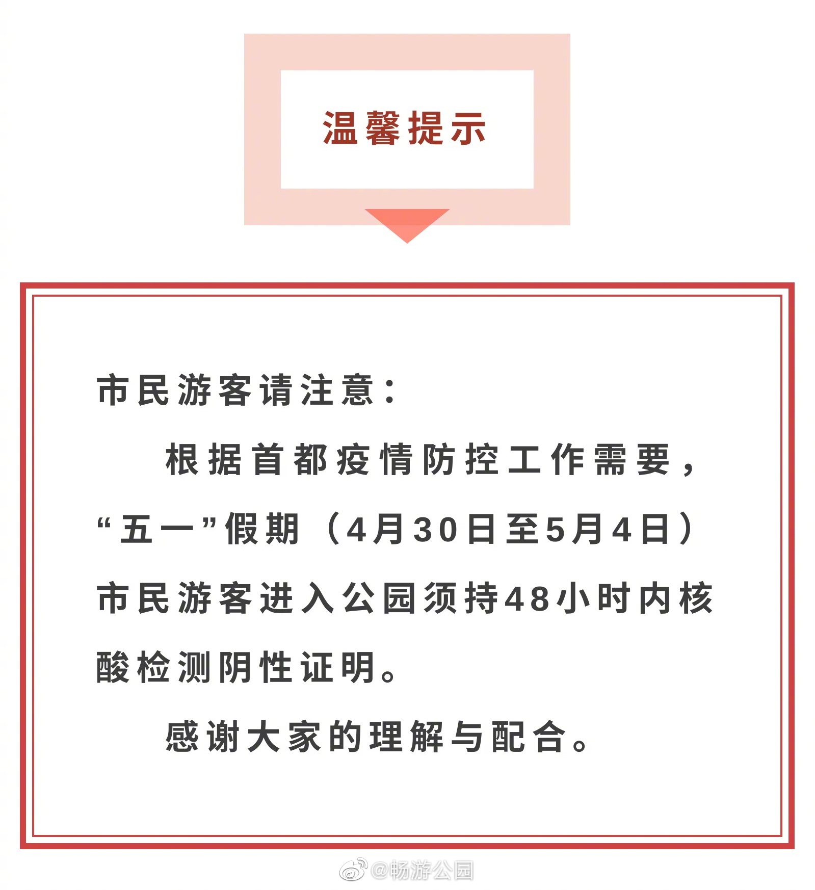 新京报快讯(记者张璐)据北京市公园管理中心消息,根据首都疫情防控工作需要,“五一”假期(4月30日至5月4日)期间市民游客进入公园须持48小时内核酸检测阴性证明。