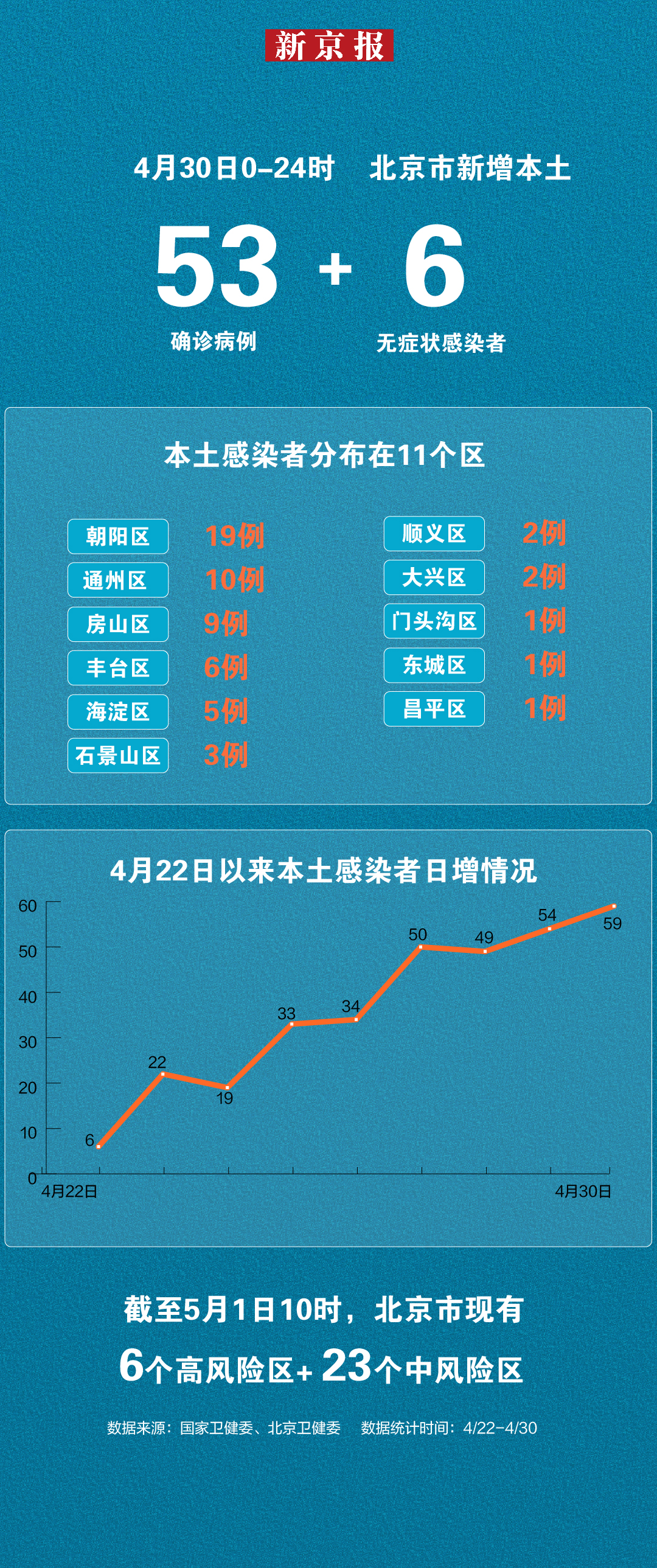 4月30日0时至24时,北京新增53例本土确诊病例(确诊病例1至26、53昨日已通报)和6例无症状感染者(无症状感染者1至4昨日已通报),无新增疑似病例;无新增境外输入确诊病例、疑似病例,新增1例境外输入无症状感染者。治愈出院11例。