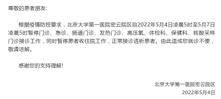 新京报讯 据宜居密云官微消息,根据疫情防控要求,北京大学第一医院密云院区自2022年5月4日凌晨5时至5月7日凌晨5时暂停门诊、急诊、肠道门诊、发热门诊、高压氧、体检科、保健科、核酸采样门诊接诊工作,同时暂停患者收住院工作,正常接诊透析患者。由此造成您就诊不便,敬请谅解。