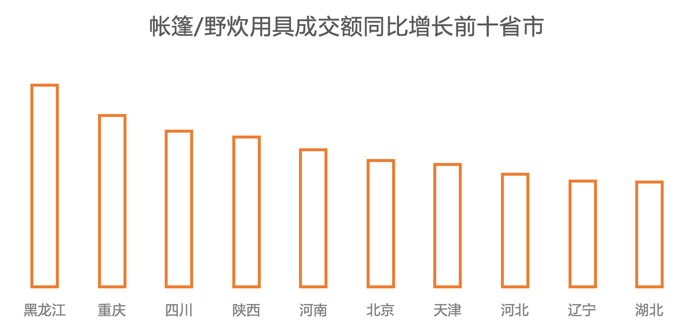 据京东销售情况显示,东北和西南的用户购买野外露营装备增长最快,其中四川省消费者的成交金额甚至超过江苏浙江等,排名全国第三。而陕西、河南等省也不甘落后,挤入全国增幅TOP5。