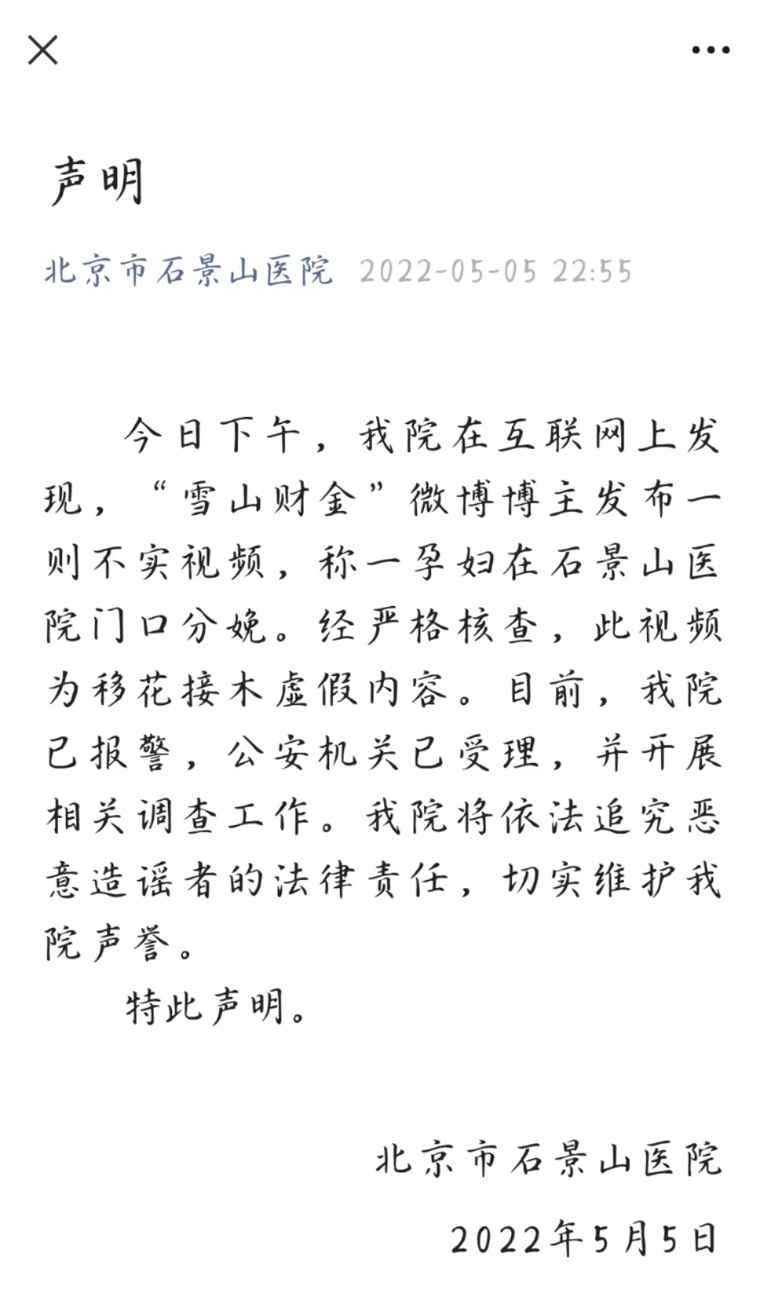 今日下午,我院在互联网上发现,“雪山财金”微博博主发布一则不实视频,称一孕妇在石景山医院门口分娩。经严格核查,此视频为移花接木虚假内容。目前,我院已报警,公安机关已受理,并开展相关调查工作。我院将依法追究恶意造谣者的法律责任,切实维护我院声誉。