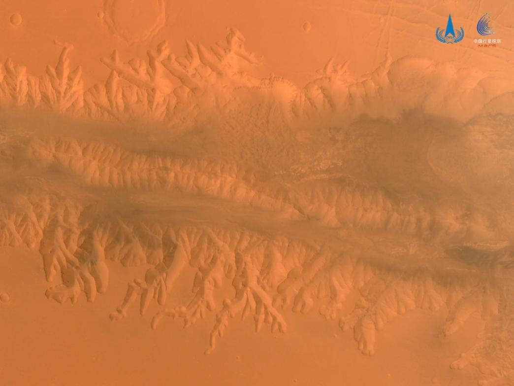 在环绕火星期间,“天问一号”环绕器携带的7台载荷全部开机,持续开展火星全球遥感探测。高分辨率相机于2022年4月17日拍摄的分辨率约0.8米/像素的火星特里奥莱环形坑影像,显示了坑壁上“季节性斜坡纹”。中分辨率相机于2022年4月1日拍摄的火星水手谷局部地貌影像,分辨率约为65米/像素。