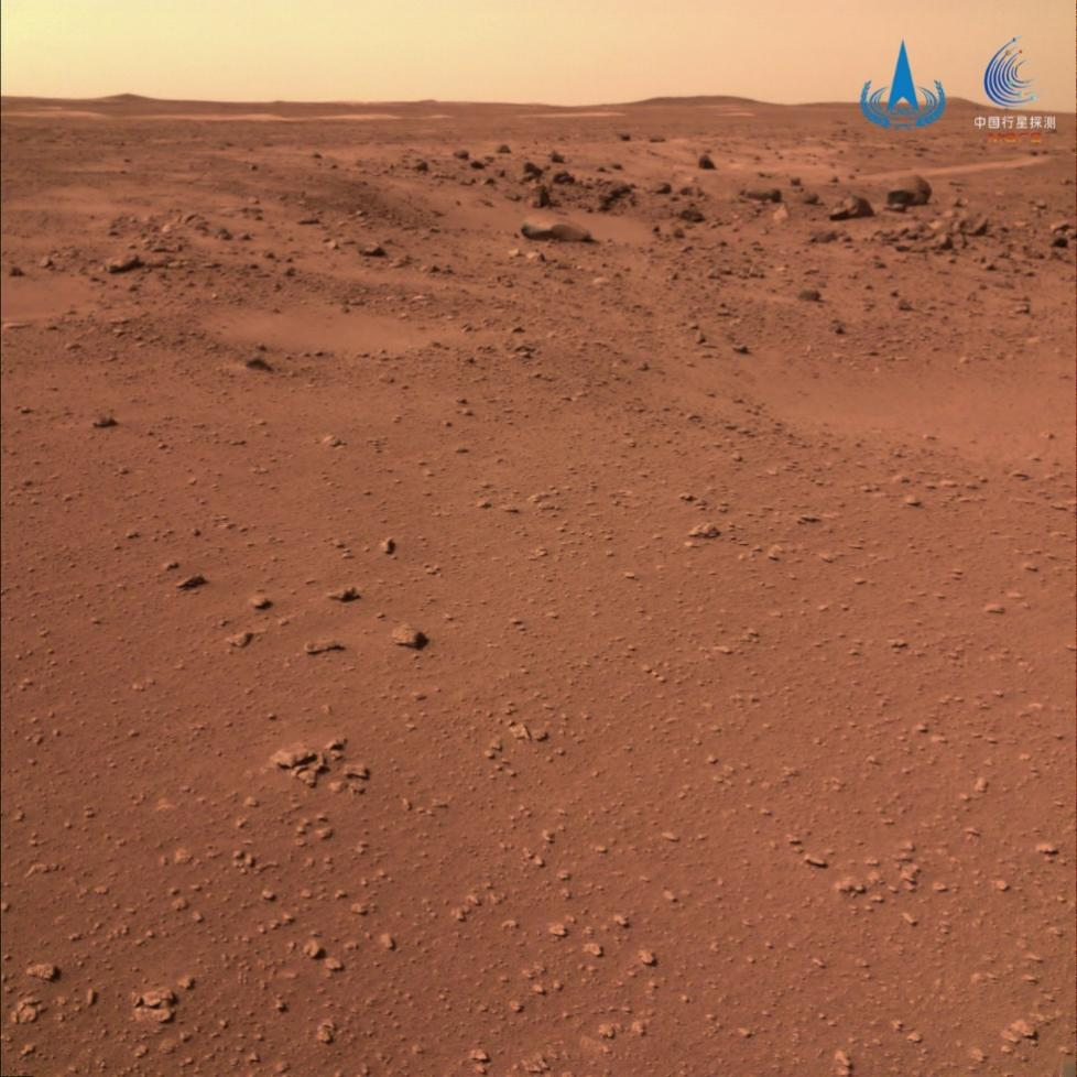 “祝融号”火星车于2021年8月15日完成了既定90个火星日的巡视探测任务后,继续开展拓展巡视探测任务。它的导航地形相机于2022年4月10日(着陆后第323火星日)拍摄的火星表面撞击坑附近分布的石块影像。