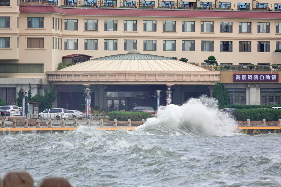 2021年9月7日,山东省烟台市滨海北路,大量海水冲上地面。图/IC photo