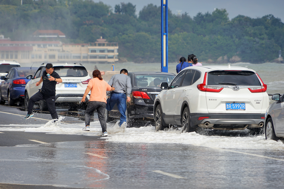 2021年9月7日,山东省烟台市滨海北路,人们在躲避涌上道路的海水。图/IC photo
