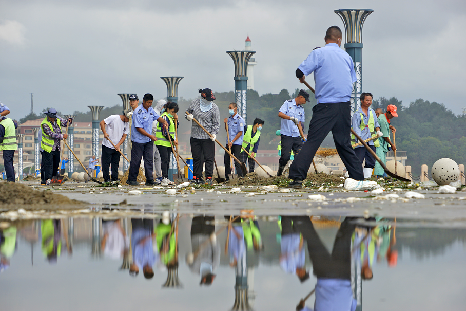 2021年9月7日,山东省烟台市滨海广场,工作人员正在清理被大浪冲上来的垃圾。图/IC photo