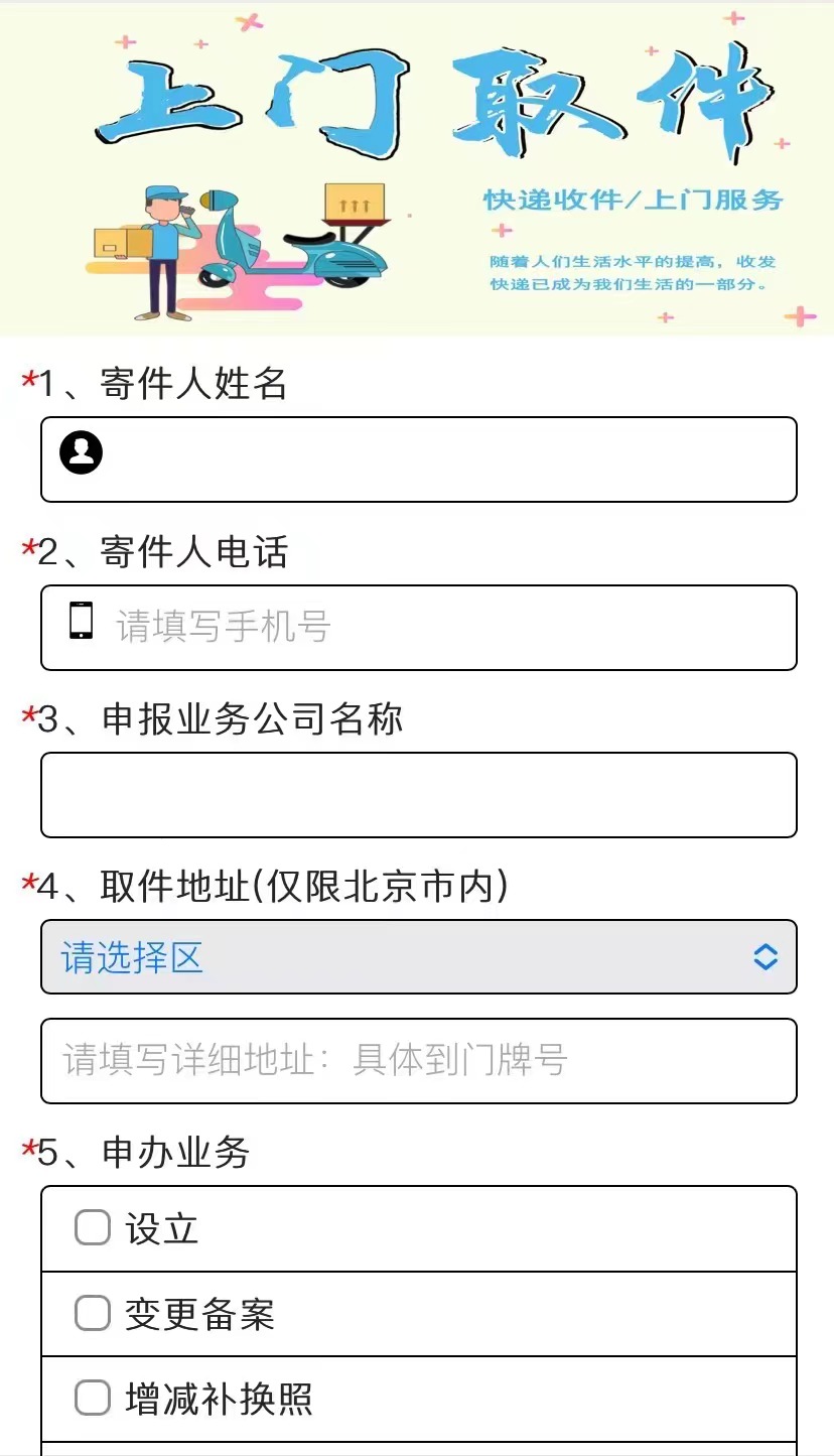 “上门取件”模块页面截图