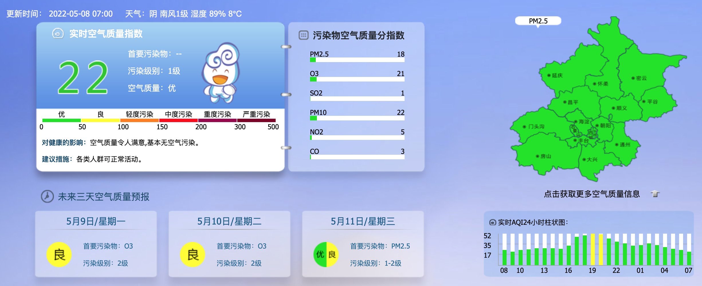 据北京市生态环境监测中心今早7时数据,目前实时空气质量指数22,污染级别1级,空气质量为优。