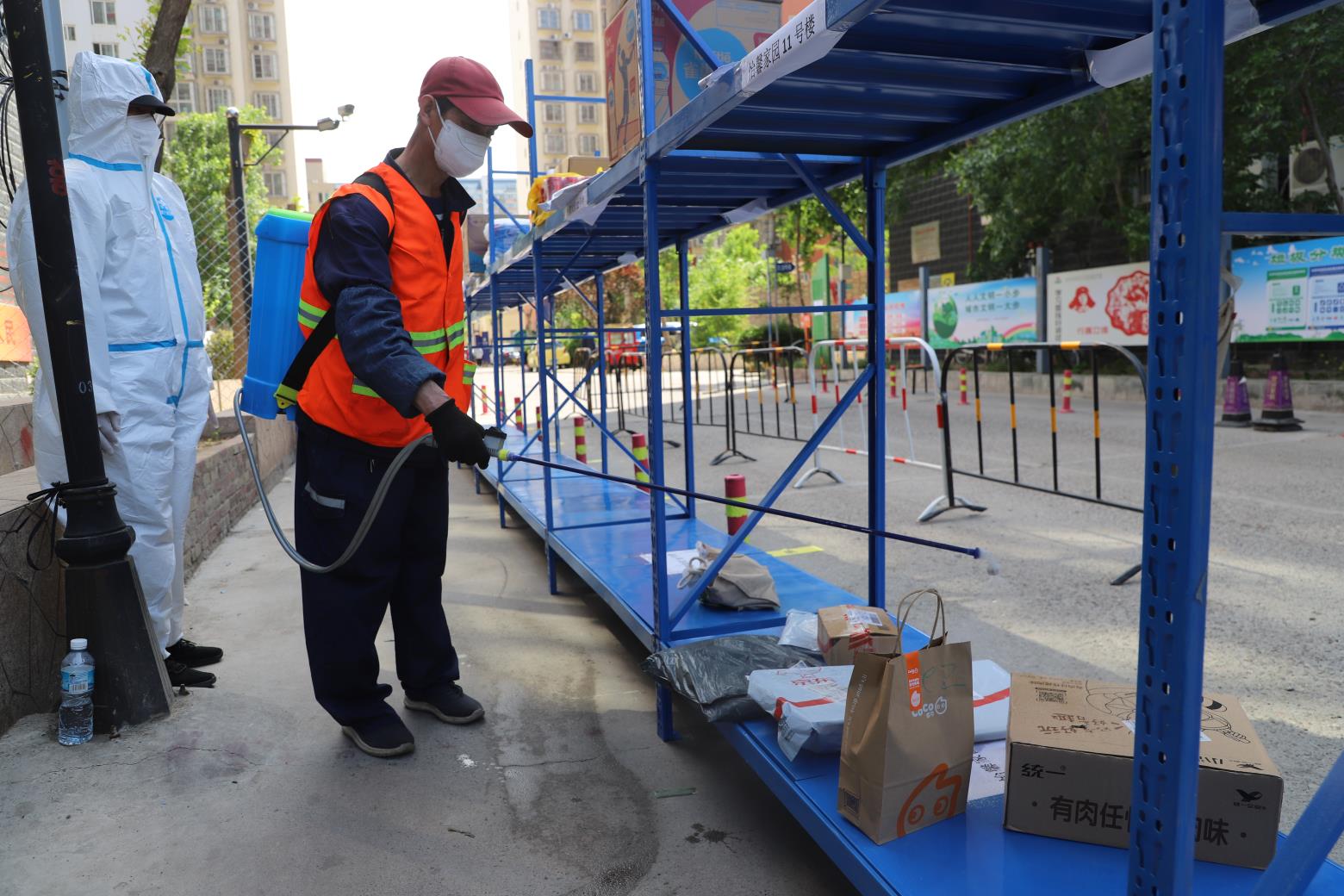 顺义怡馨家园大门口的快递交接存储处,工作人员正给外卖、快递进行消杀。顺义胜利街道供图 闫兆松 摄