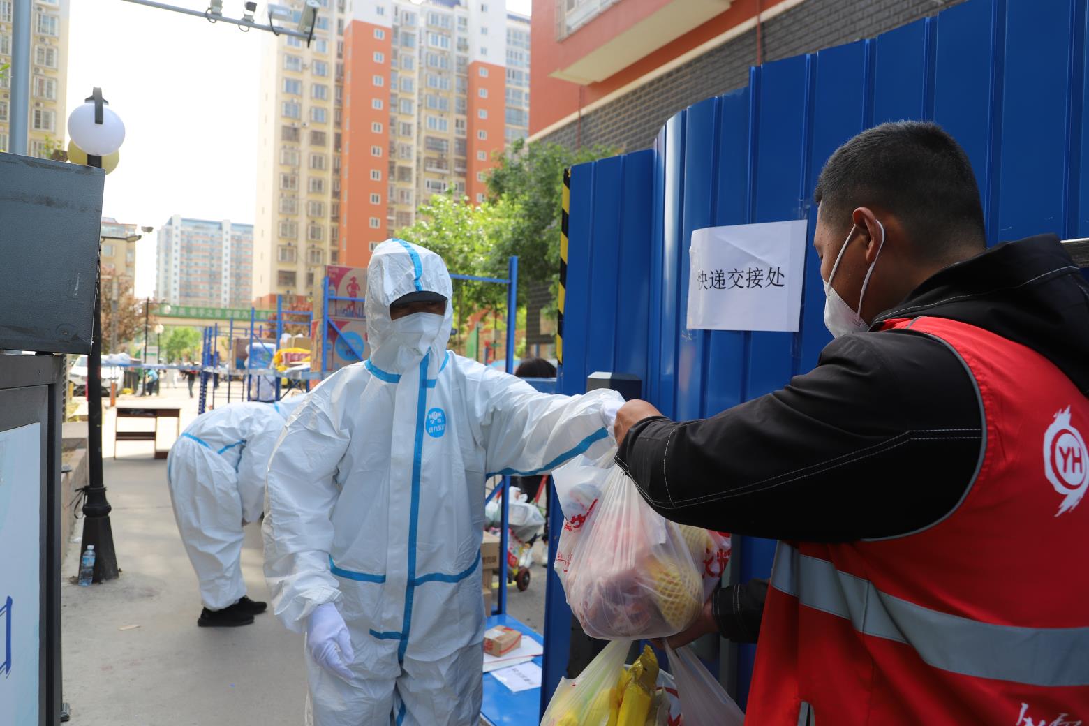 顺义怡馨家园大门口,外卖员正和防疫人员交接外卖物品。顺义胜利街道供图 闫兆松 摄