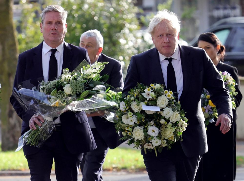 2021年10月16日,英国首相、保守党领袖鲍里斯·约翰逊(前右)、工党领袖斯塔默(前左)来到英国埃塞克斯郡滨海利献花,悼念遇刺身亡的英国保守党议员戴维·阿梅斯。新华社发(英国首相府供图)