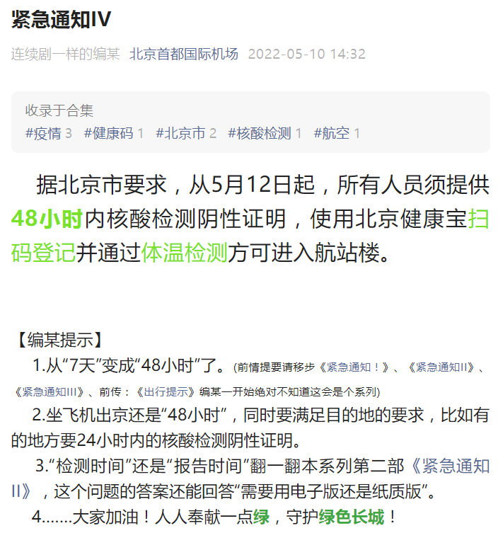 新京报讯 据北京首都国际机场官微消息,据北京市要求,从5月12日起,所有人员须提供48小时内核酸检测阴性证明,使用北京健康宝扫码登记并通过体温检测方可进入航站楼。