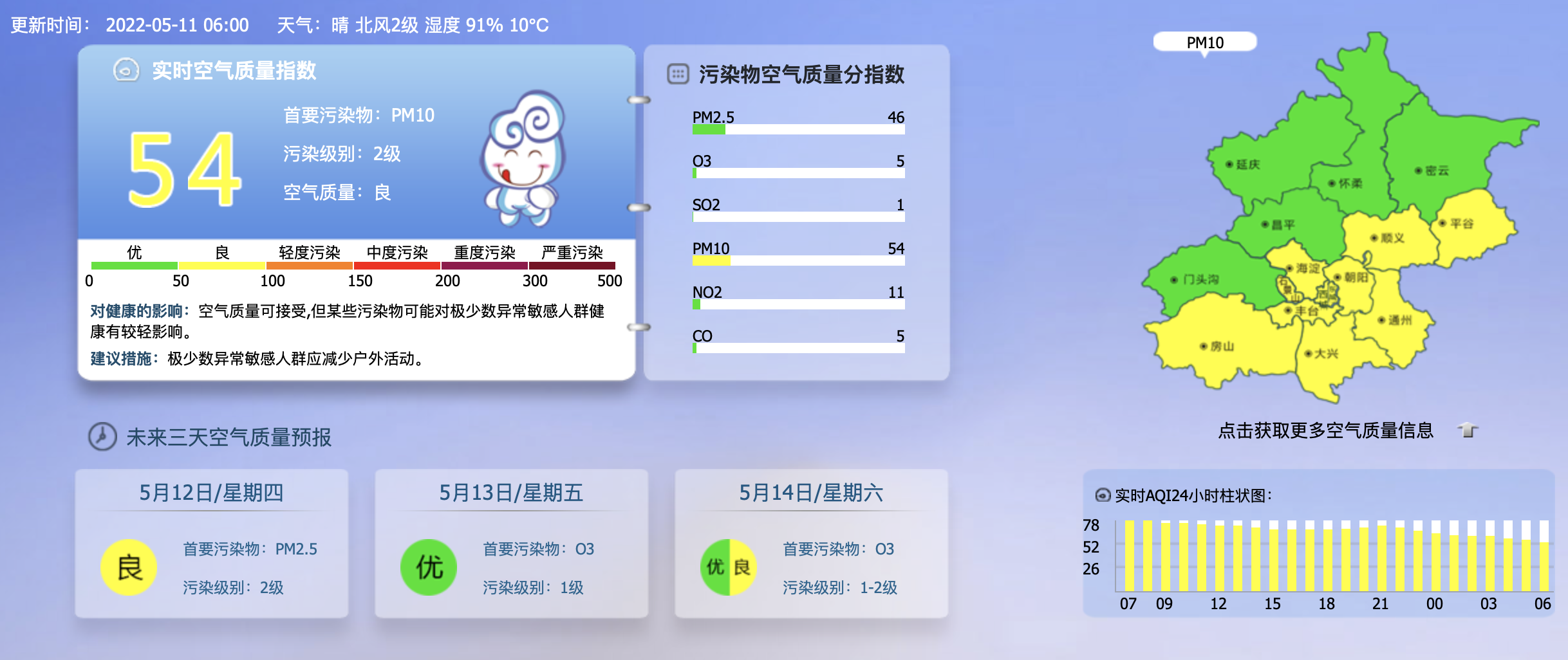 据北京市生态环境监测中心今早7时数据,目前实时空气质量指数54,污染级别2级,首要污染物PM10,空气质量良。