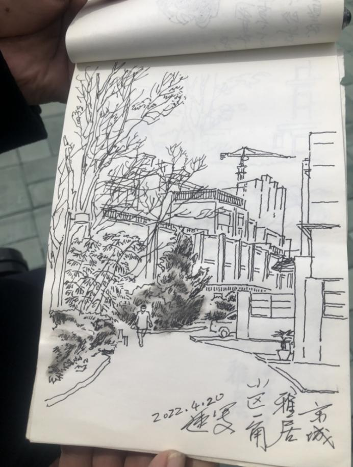 王为民速写本上的小区一角。(新京报见习记者 术竞予 摄)