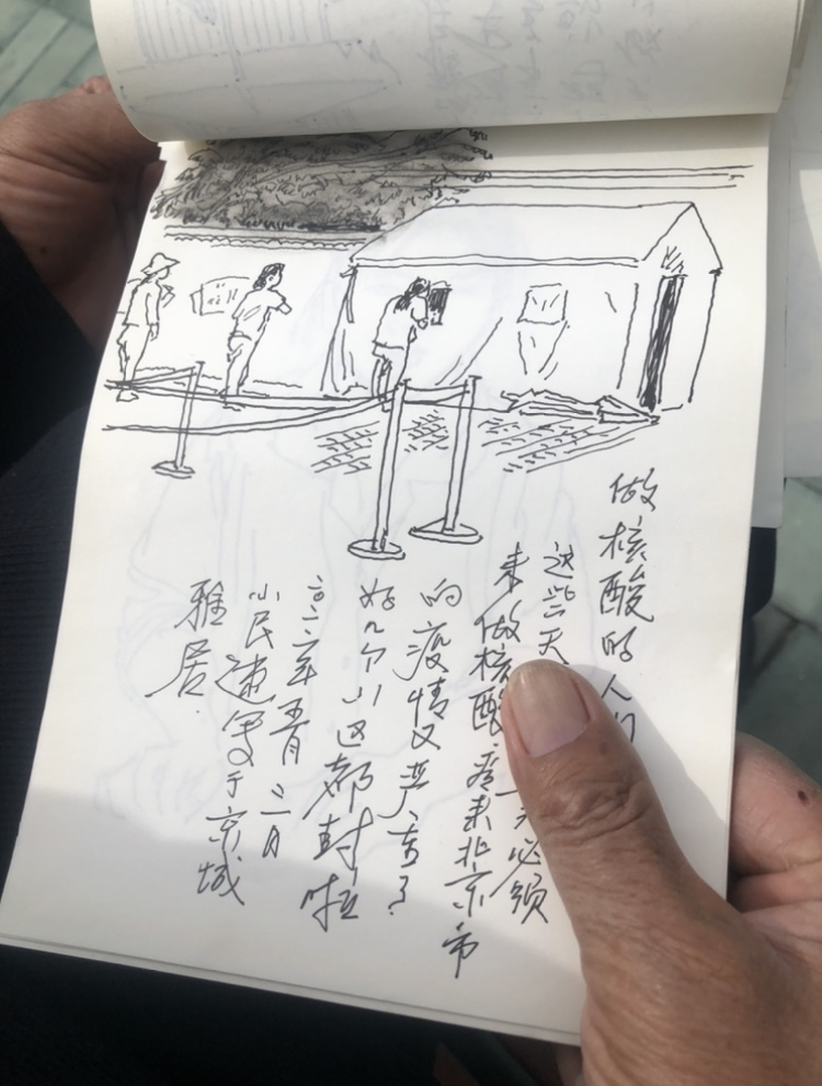 王为民速写本上的核酸检测瞬间。(新京报见习记者 术竞予 摄)