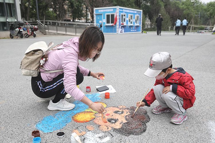5月10日,在西城区月坛街道南沙沟核酸检测点,街道“两新”组织党员志愿者、新业态群体和孩子们共同绘制出一条条充满创意的“两米线”。疫情防控常态化背景下,美丽的“两米线”不仅提醒居民保持安全距离,同时还可以欣赏别样的风景。图为:一位小学生自告奋勇加入到活动中,当场构思创作了《北京星空》,让北京大气的高楼和浩瀚的宇宙同框。