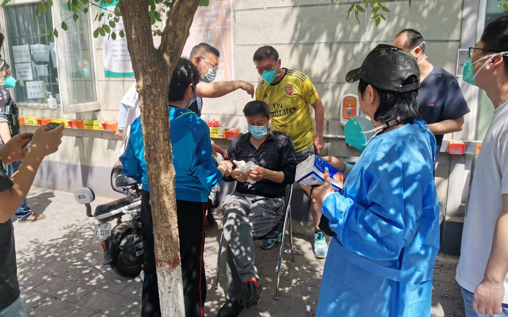 只见一位老人倒在地上,已经处于半昏迷状态。两位在现场做核酸检测的医生火速跑来为伤者包扎后,社区工作人员将老人送往医院。两位医生又穿上防护服,回到岗位。