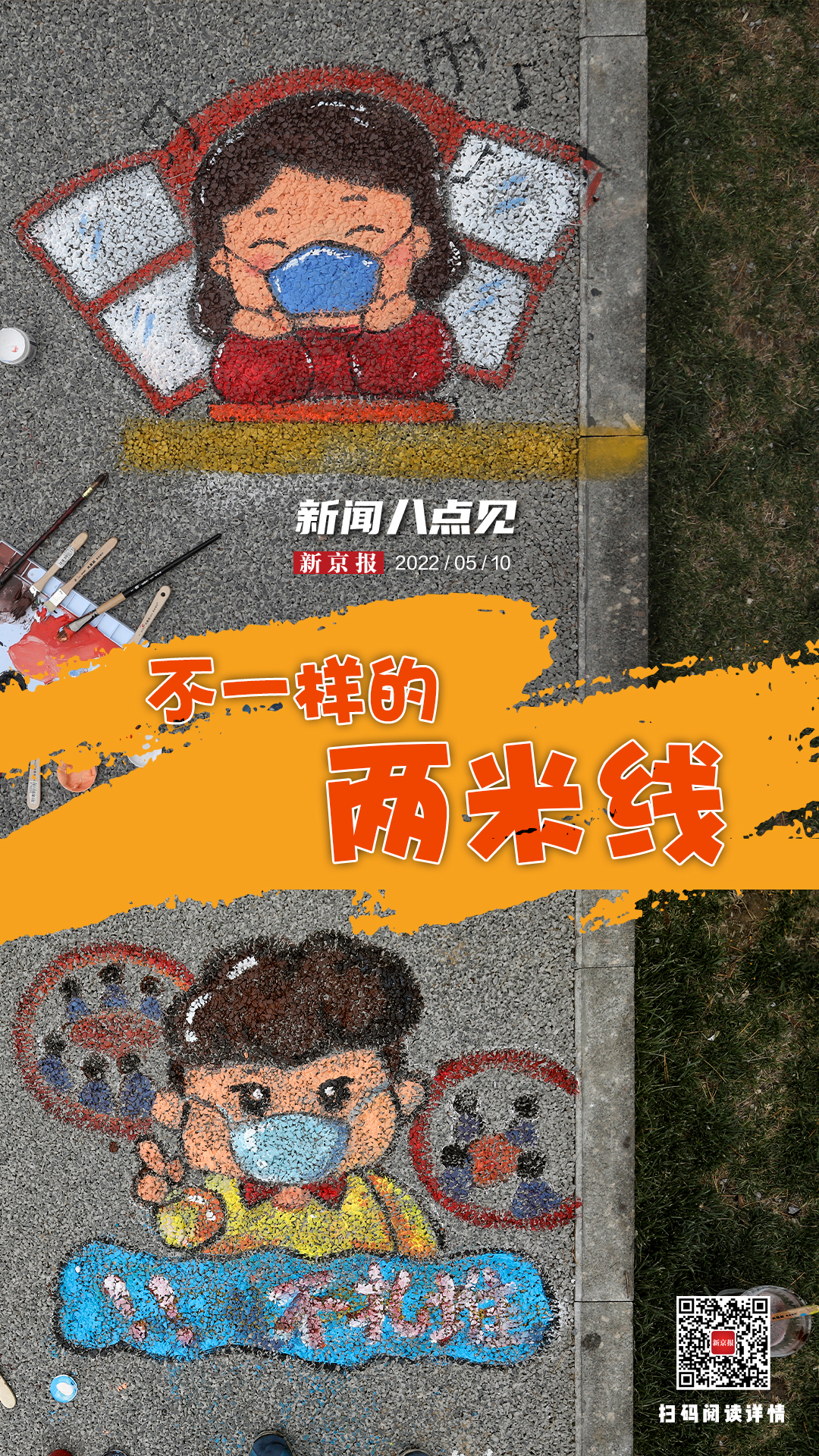 5月10日,在西城区月坛街道南沙沟核酸检测点,街道“两新”组织党员志愿者、新业态群体和孩子们共同绘制出一条条充满创意的“两米线”。疫情防控常态化背景下,美丽的“两米线”时刻提醒居民保持安全距离。阅读全文>>>