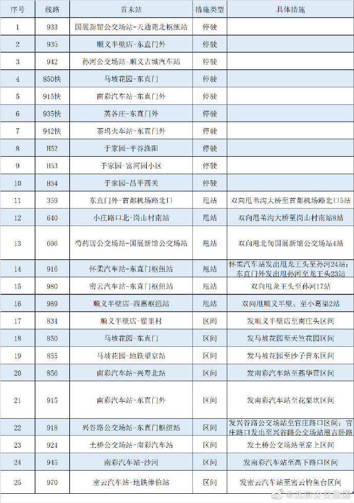 新京报讯 据北京公交集团官博消息,按照疫情防控工作要求,自5月11日首车起,途经顺义区的25条公交线路采取临时调度措施。具体见附表。