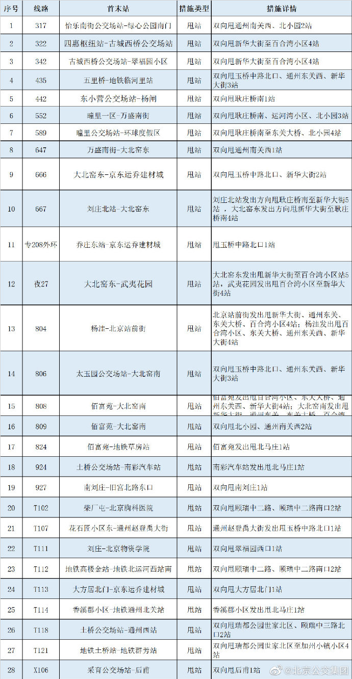 新京报讯 据北京公交集团官博消息,按照疫情防控工作要求,5月11日途经通州区封控区周边的28条线路采取临时调度措施(在其他区域已采取的调度措施不再重复公布)。具体情况见附表。
