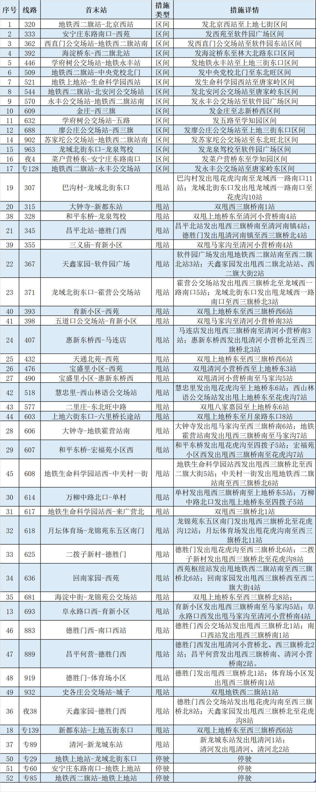 途经海淀区清河街道及周边划定重点区域的52条公交线路采取甩站、区域外区间、停驶等措施。