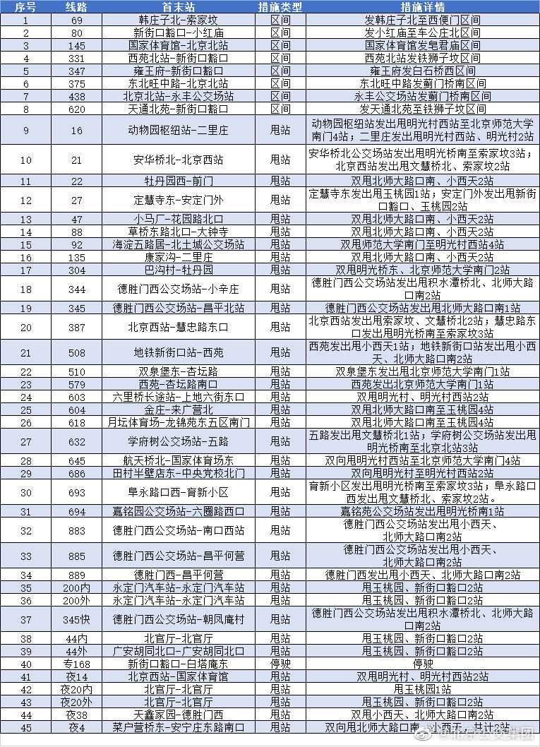 途经海淀区北太平庄街道部分区域的45条公交线路采取甩站、区域外区间、停驶等措施。