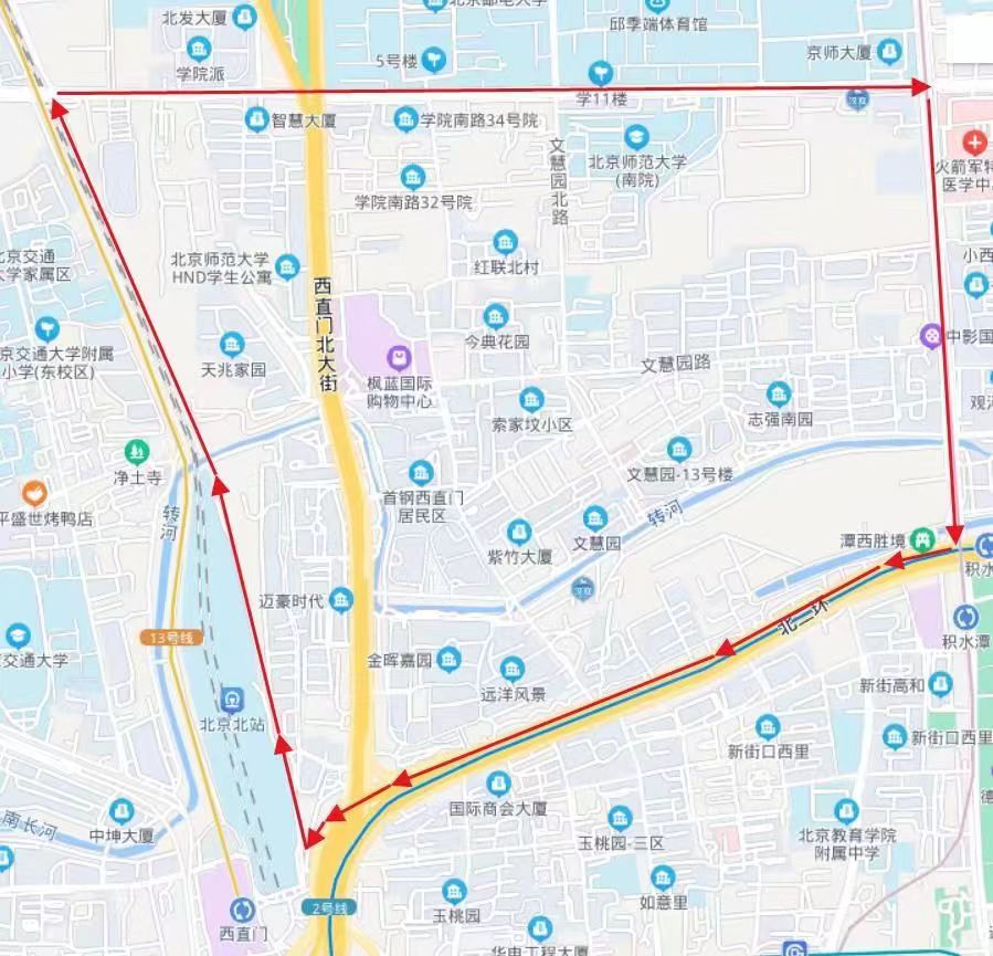 城铁13号线(不含)-西直门北滨河路(不含)道路沿线以东、新街口外大街(不含)以西、学院南路(不含)以南、德胜门西大街(不含)以北。