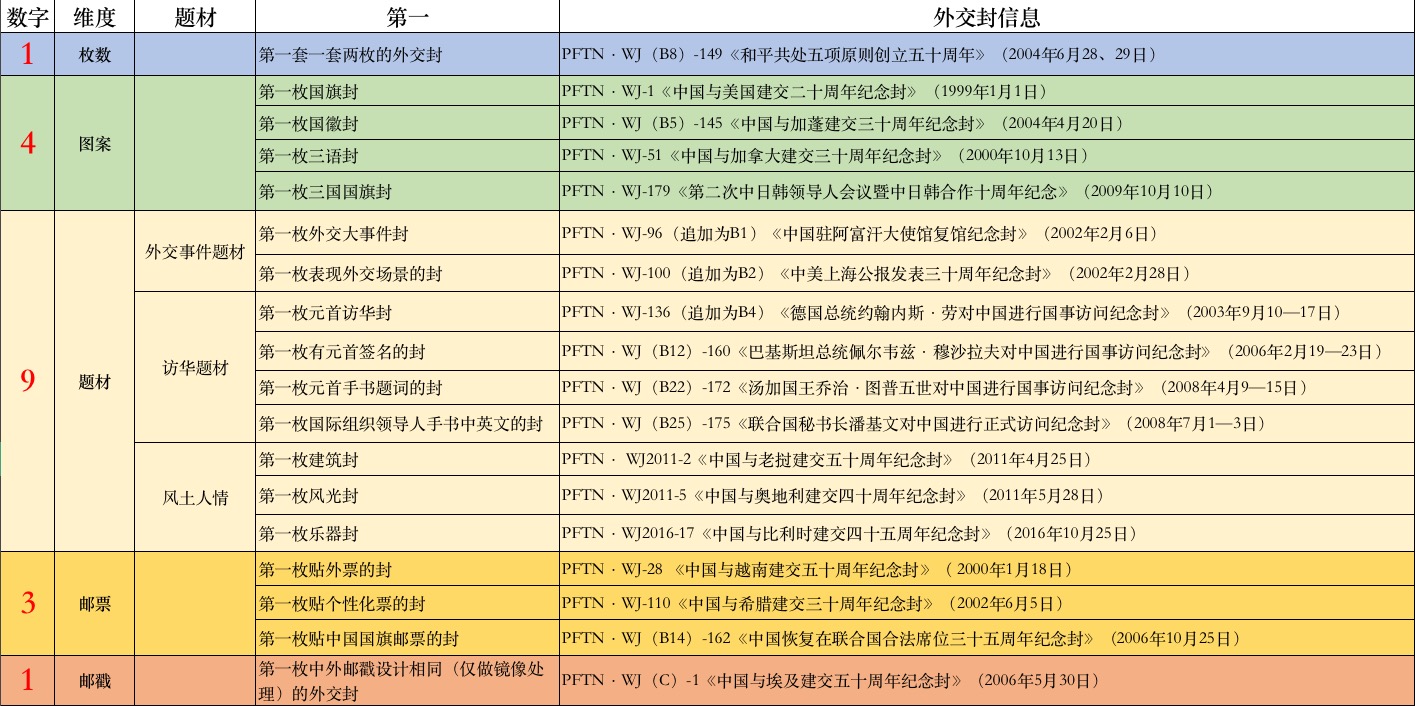 外交封还有三个特点,开创性、政治性、国际性。任永信补充:“它们的编号是PFTN·WJ,PFTN代表特种纪念封,WJ表示外交系列。从1999年1月到现在,集邮总公司和外交部联合发行的外交封总共是447套448枚,只有一套是两枚的。”