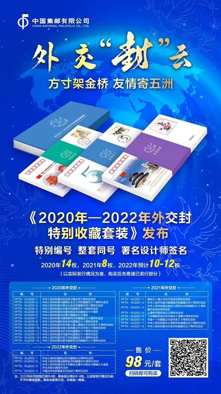 新京报讯(记者吴龙珍)5月12日,中国邮政《2020年——2022年外交封特别收藏套装》开始预订。本次纪念套装内含2020年以来发行的外交封预计共34枚,其中2020年14枚,2021年8枚,2022年外交封现已发行4枚,剩余部分预计6—8枚(以正式发行情况为准)。5月12日举办的“文脉·国脉大讲堂”专题直播节目,以 “外交‘封’云——方寸架金桥 友情寄五洲”为主题,在直播中特邀嘉宾外交部原副部长吉佩定、外交部集邮协会原秘书长马小玲和中国集邮有限公司总经理任永信分享外交封的背后故事,并对其中的特色和意义进行了解读。