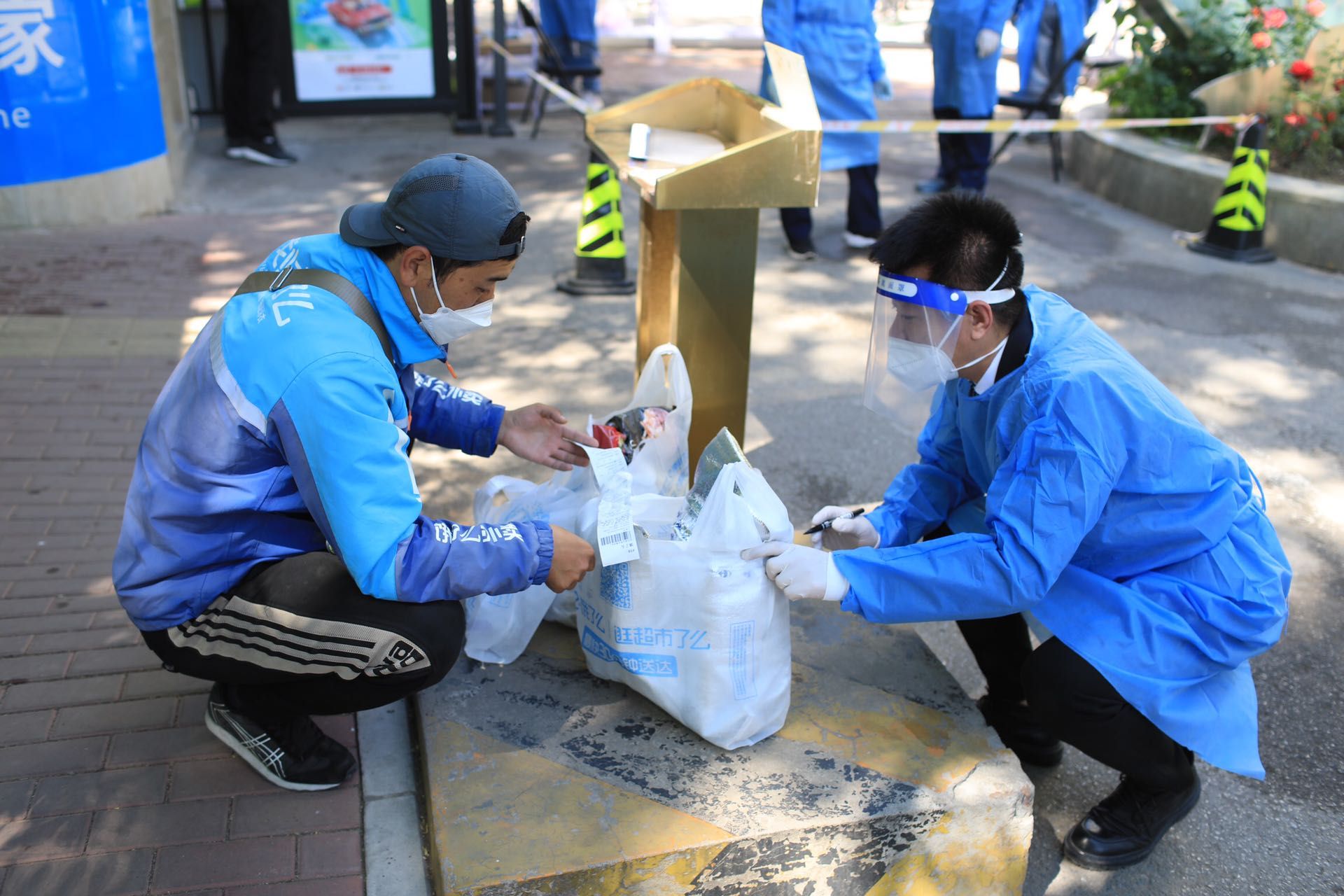 社区工作人员接收外卖员送来的外卖包裹。 新京报记者 浦峰 摄