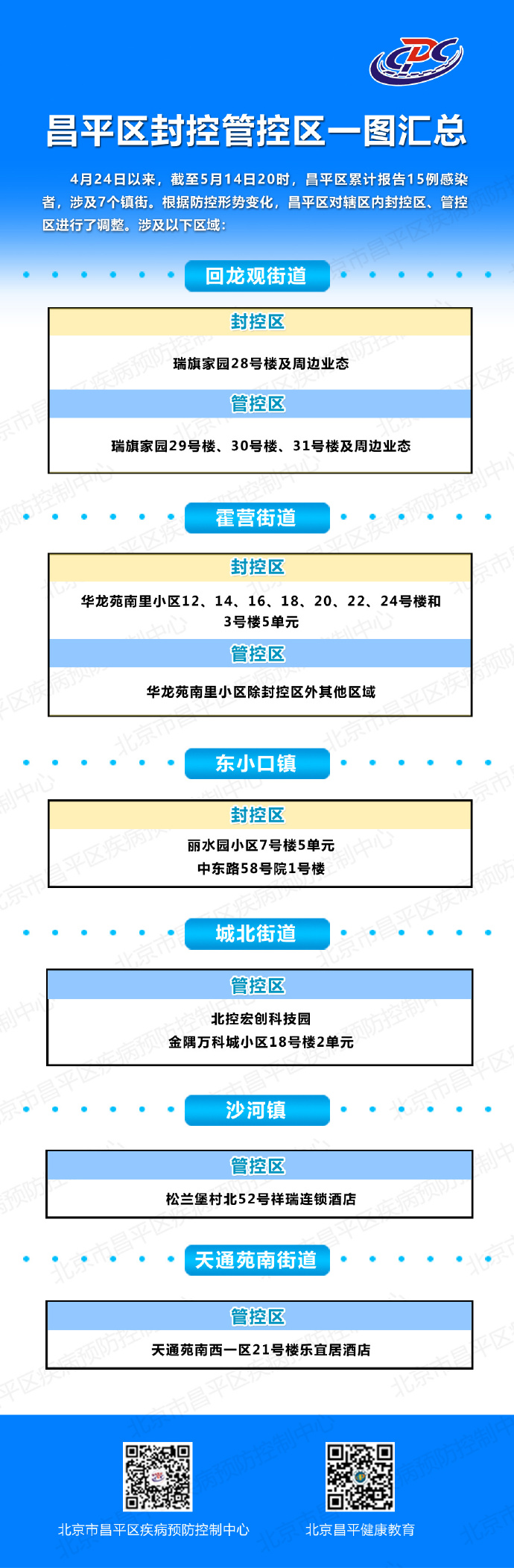 新京报讯 据北京昌平健康教育官博消息,4月24日以来,截至5月14日20时,昌平区累计报告15例感染者,涉及7个镇街。根据防控形势变化,昌平区对辖区内封控区、管控区进行了调整。
