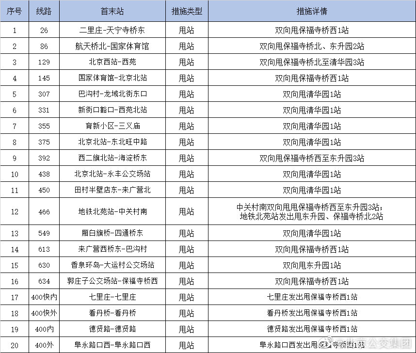 据北京公交集团官微消息,按照防疫工作要求,自5月16日首车起,途经海淀区科汇社区、水清木华园小区周边的20条公交线路采取甩站措施,详见附表。详情>>>