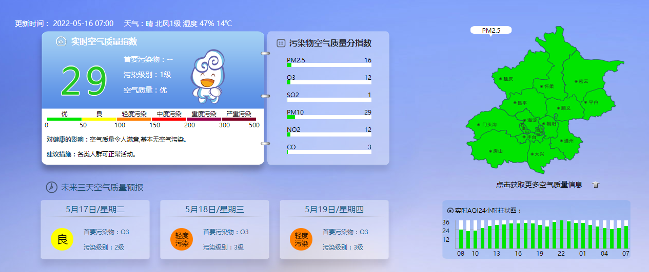 据北京市生态环境监测中心今早7时数据,目前实时空气质量指数29,污染级别1级,空气质量为优。