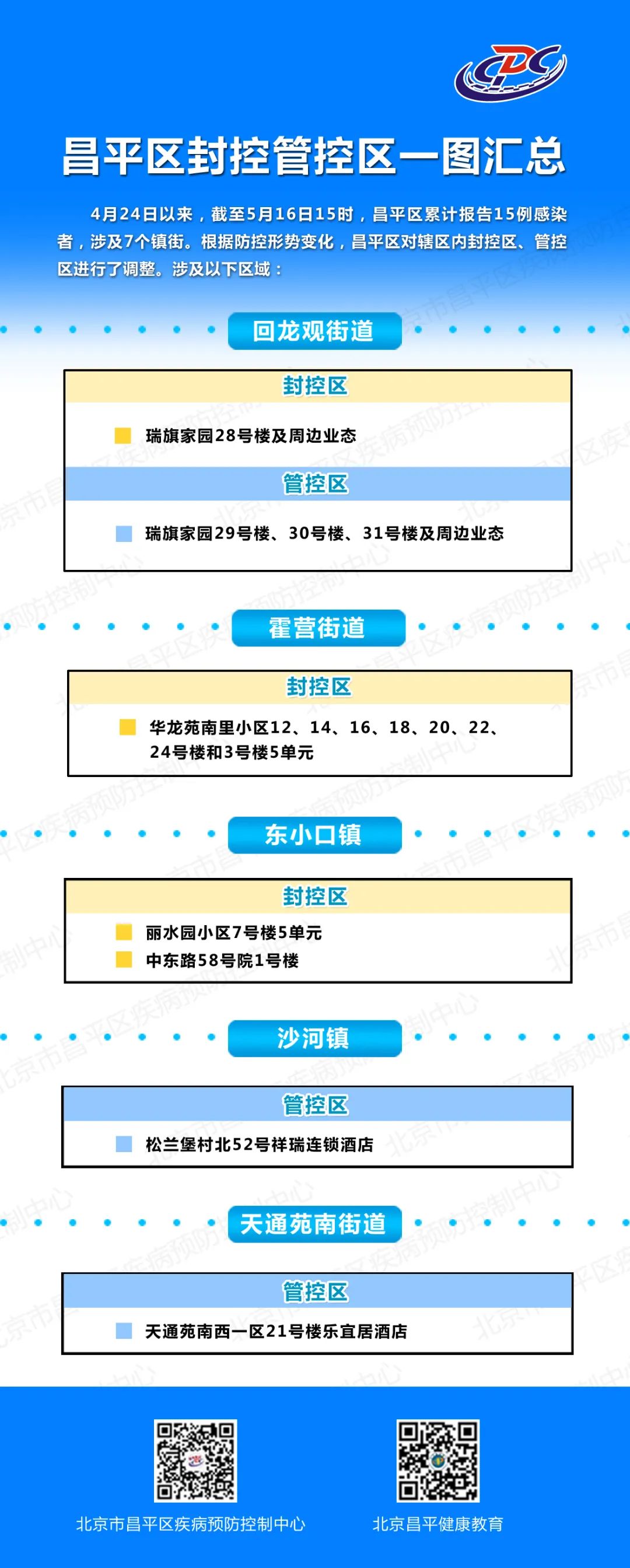 新京报讯 据北京昌平官微消息,4月24日以来,截至5月16日15时,昌平区累计报告15例感染者,涉及7个镇街。根据防控形势变化,昌平区对辖区内封控区、管控区进行了调整。