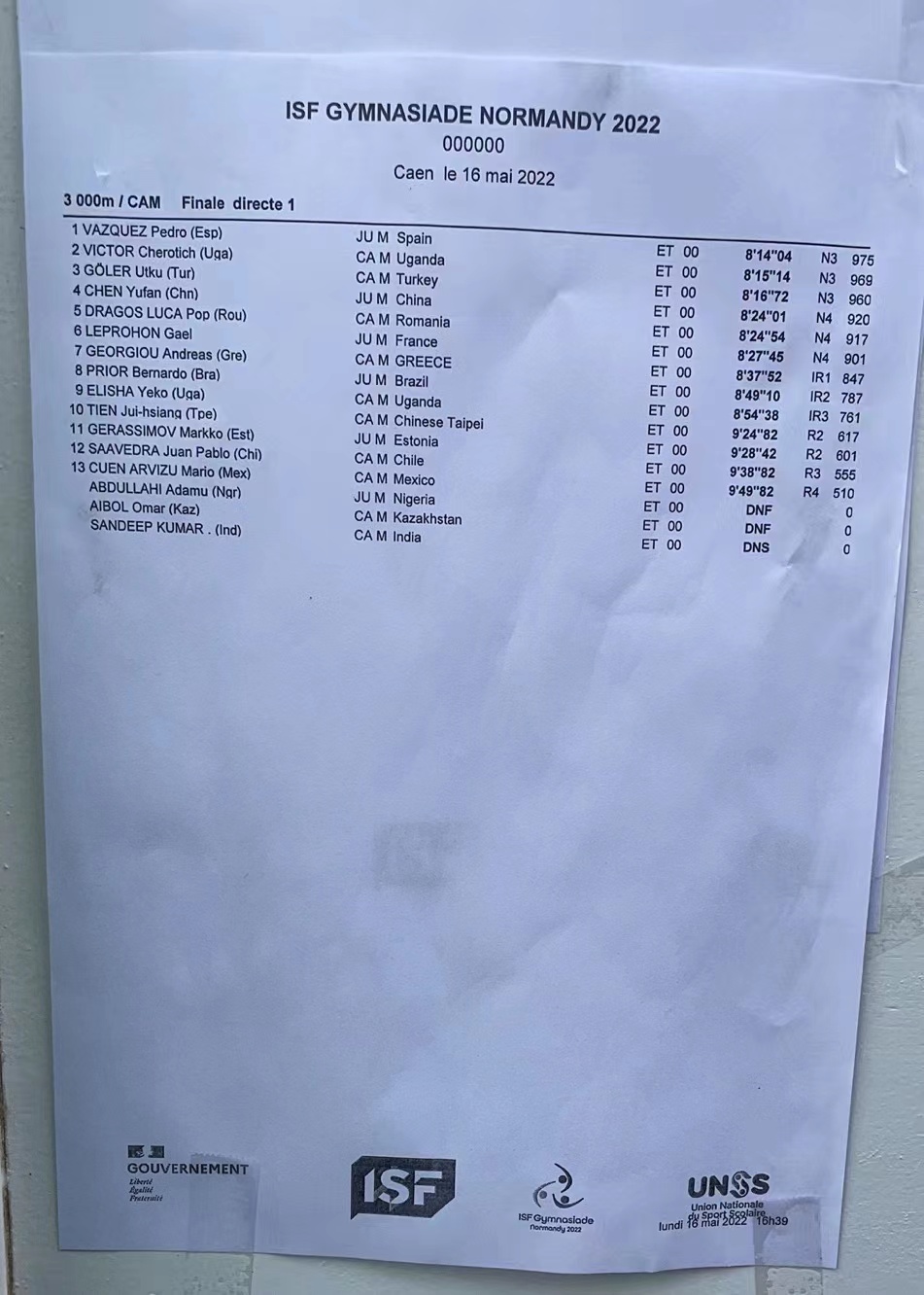 新京报讯 (记者徐邦印)5月16日,在法国诺曼底进行的第19届世界中学生夏季运动会男子3000米决赛中,北京市大兴区第一中学学生陈雨繁以8分24秒01的成绩获得第4名。接受新京报记者采访时,陈雨繁表示,对这个成绩不是很满意,“赛前想着至少也拿个前三名。”