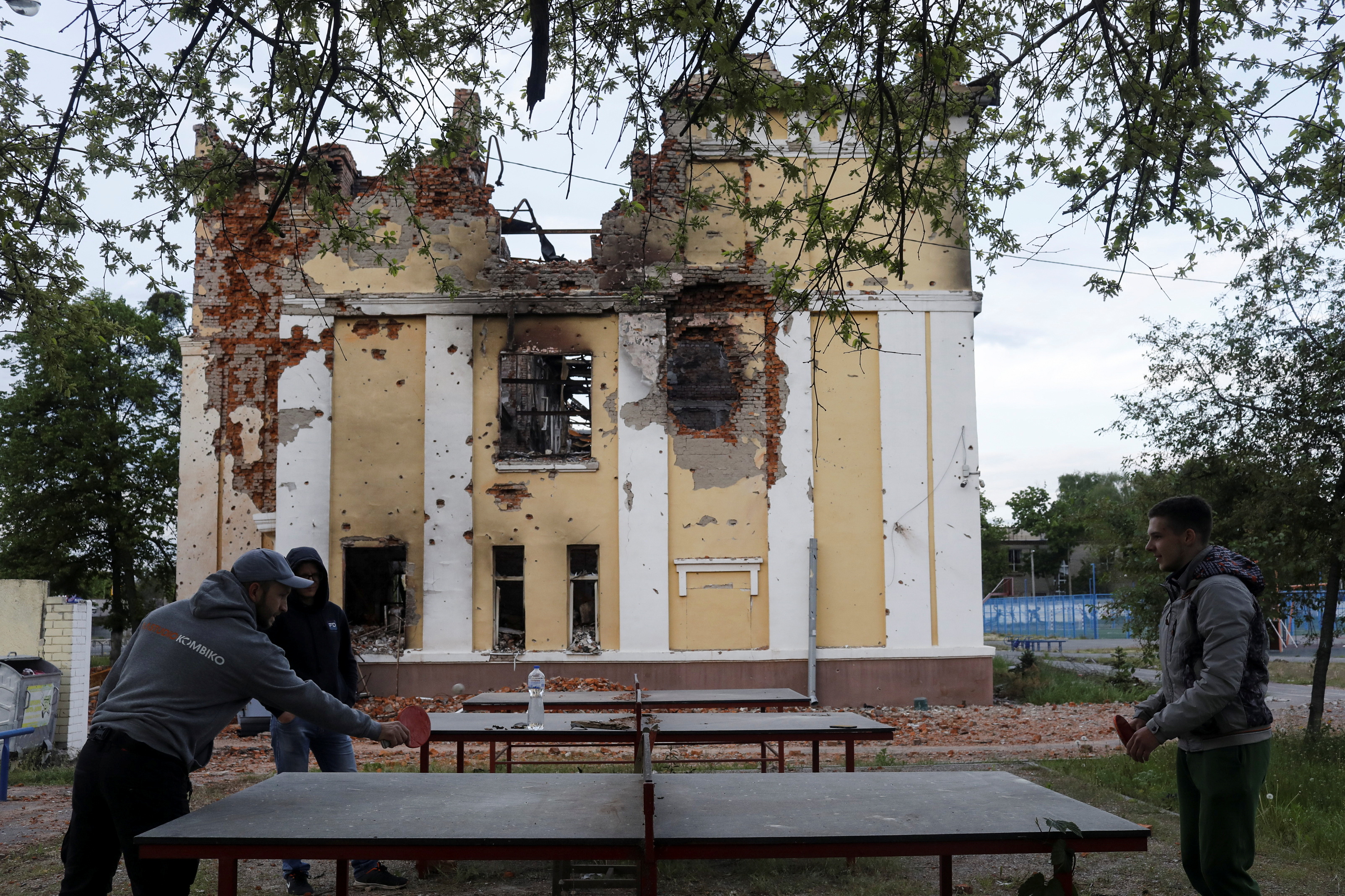 当地时间2022年5月14日,乌克兰哈尔科夫,俄乌冲突持续,一所学校受损严重,民众在操场上打乒乓球。图/IC photo