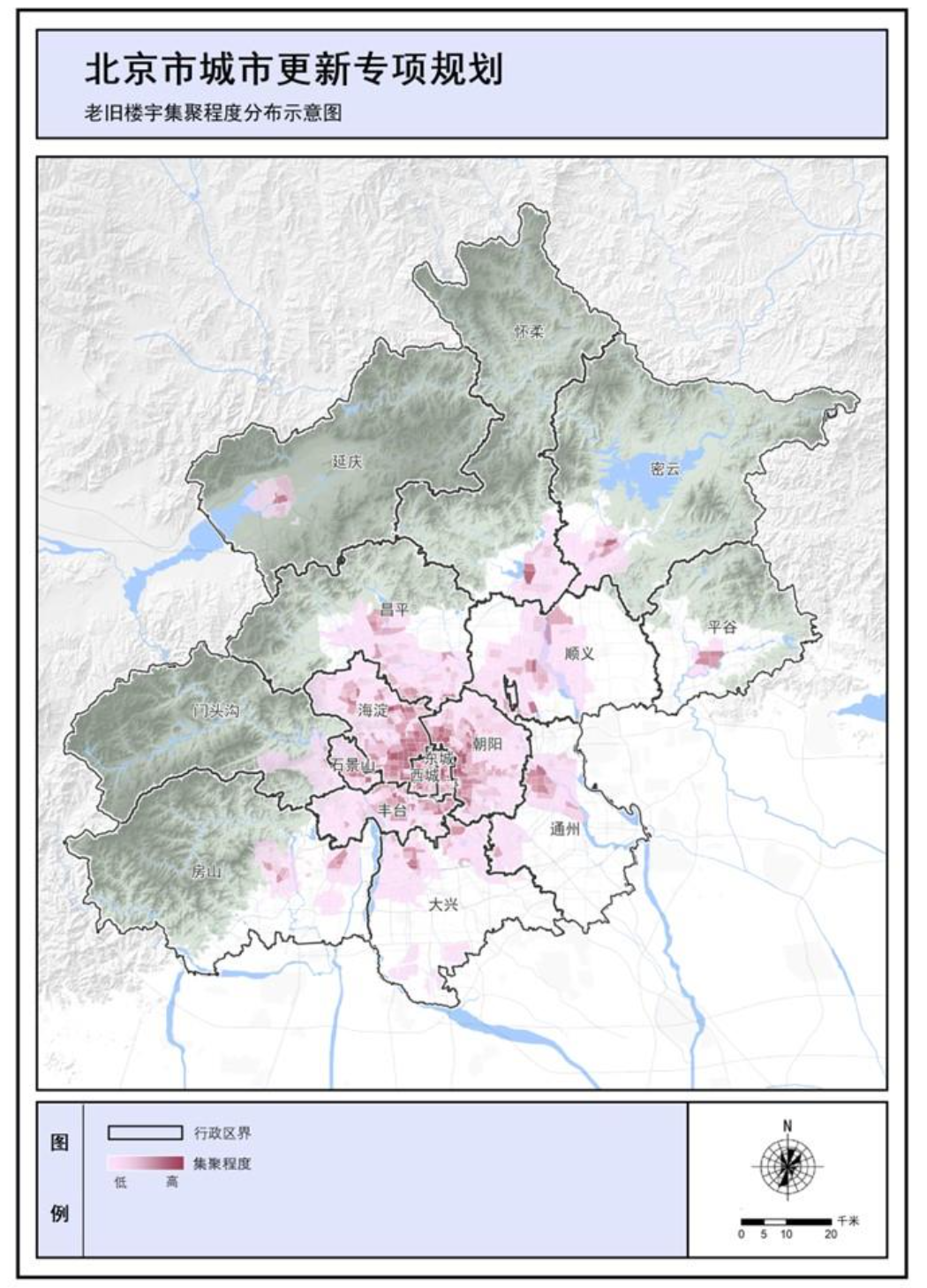 老旧楼宇集聚程度分布示意图。图源:《北京市城市更新专项规划(北京市“十四五”时期城市更新规划)》