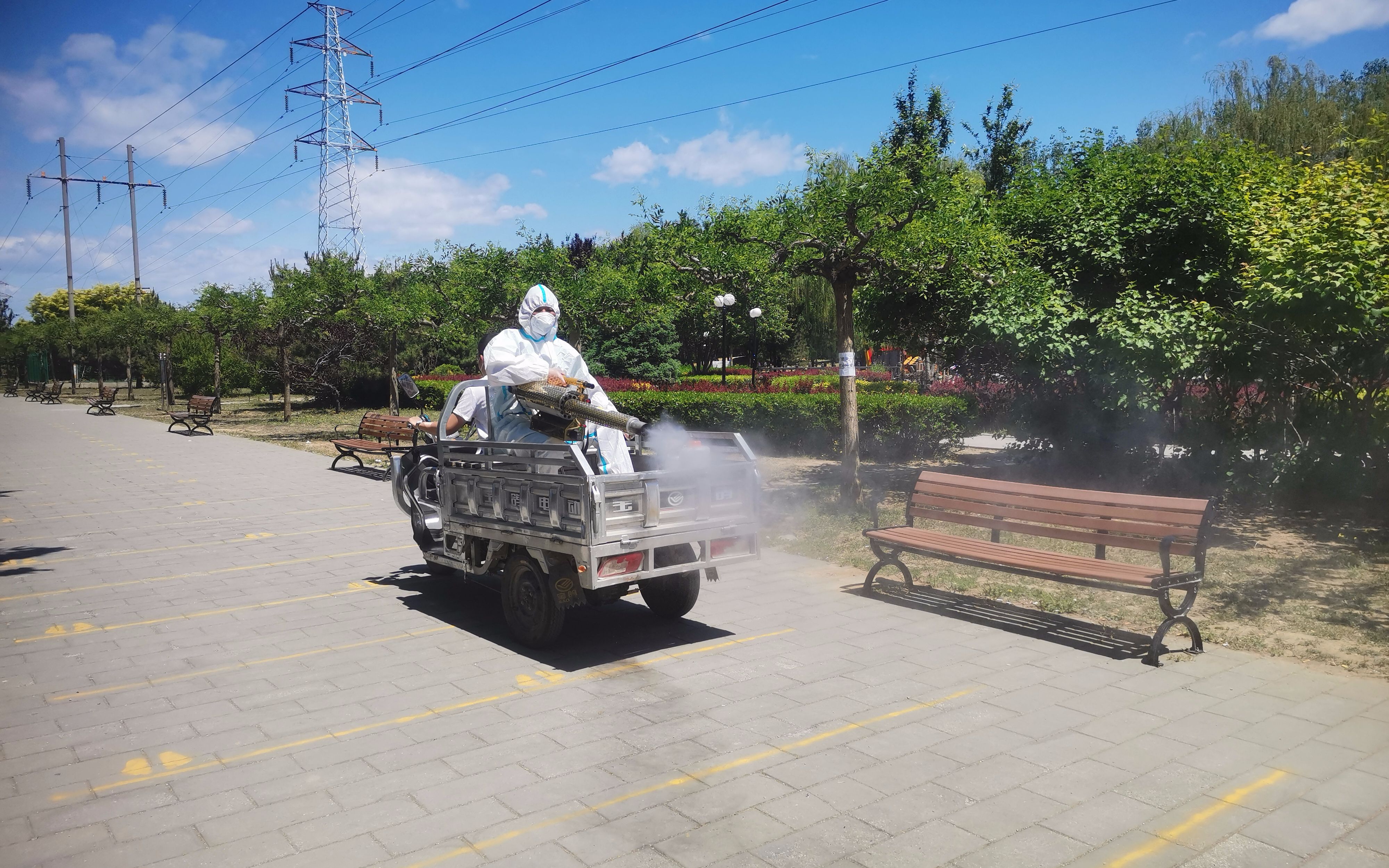 石雪峰在顺义一小区内进行消杀。受访者供图
