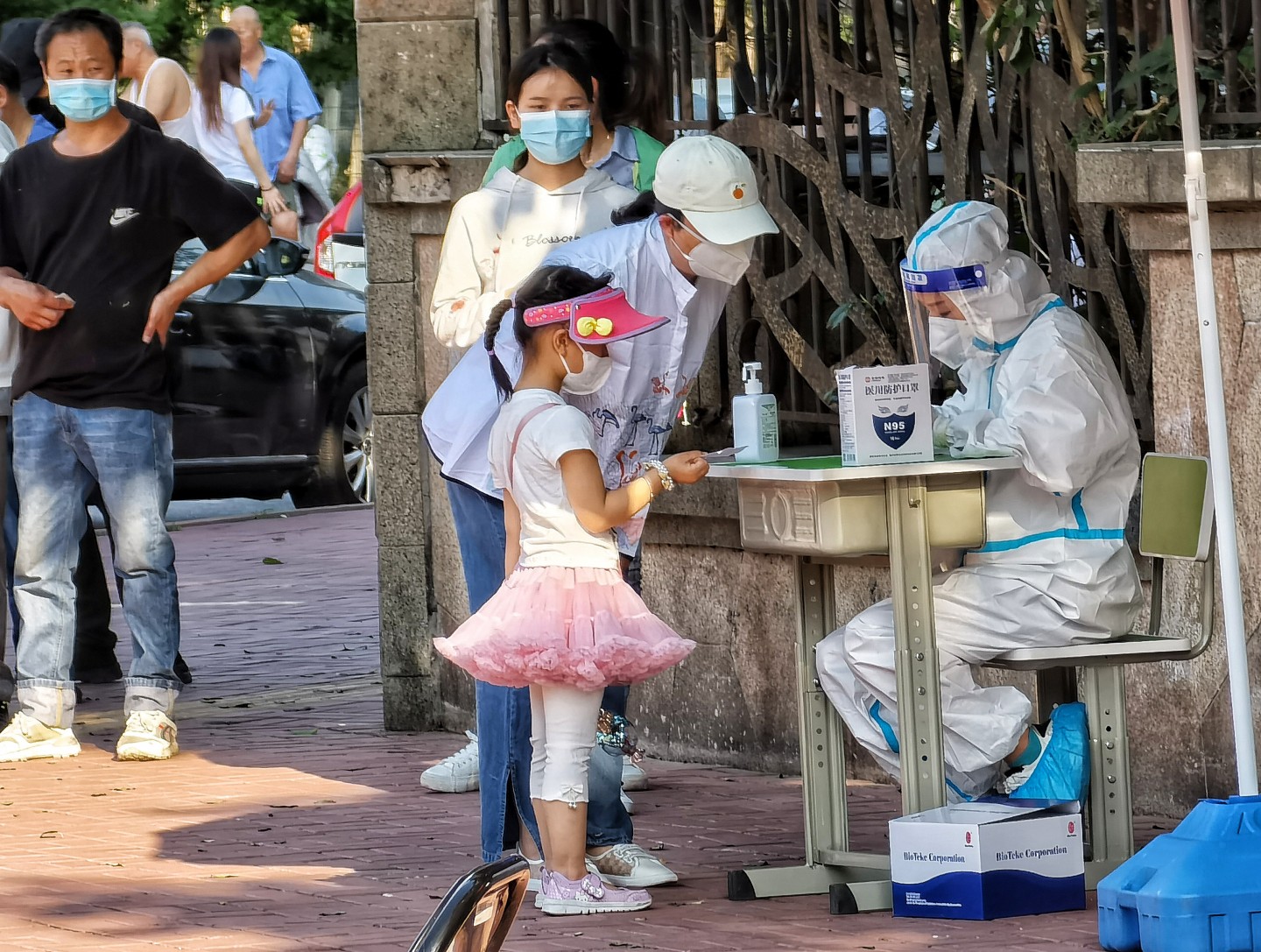 玛丽亚总在暑气最盛的午后,出现在北京市朝阳区东风乡东润枫景社区东风南小区的核酸检测点位,套着防护服,指引居民扫码登记,维持队伍秩序,忙前忙后,没有半刻停歇。