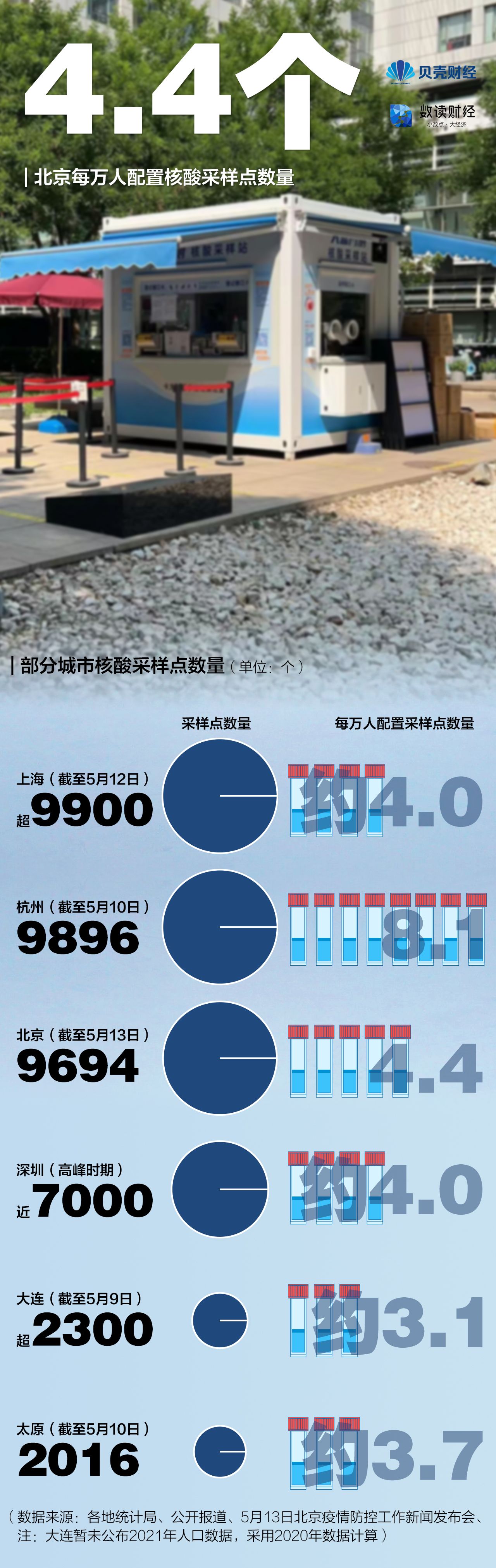 春节过后,上海核酸检测逐渐进入常态化,与此同时,核酸采样点位数量增长。以北京、上海、杭州三地为例,各地核酸“采集圈”数量均超9000个,杭州平均每万人配置8个采样点。5月4日,上海各类核酸采样点数量近9000个,每万人配置数量约为3.6个;到5月12日,上海采样点数量超过9900个,每万人配置数量约为4个。