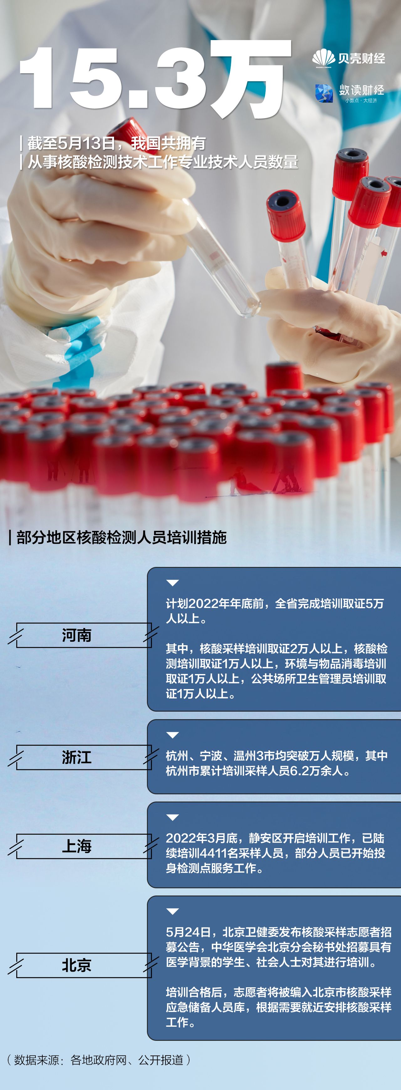 国家卫健委医政医管局监察专员郭燕红表示,截至5月13日,我国共拥有15.3万专业技术人员从事核酸检测的技术工作。2022年年初,河南发布《关于开展核酸检测相关人员项目制培训工作的通知》,计划在今年培训核酸检测相关人员5万人以上。浙江要求11个设区市均按照不少于3000人规模组建应急采样队伍,目前杭州、宁波、温州3市均突破万人规模。
