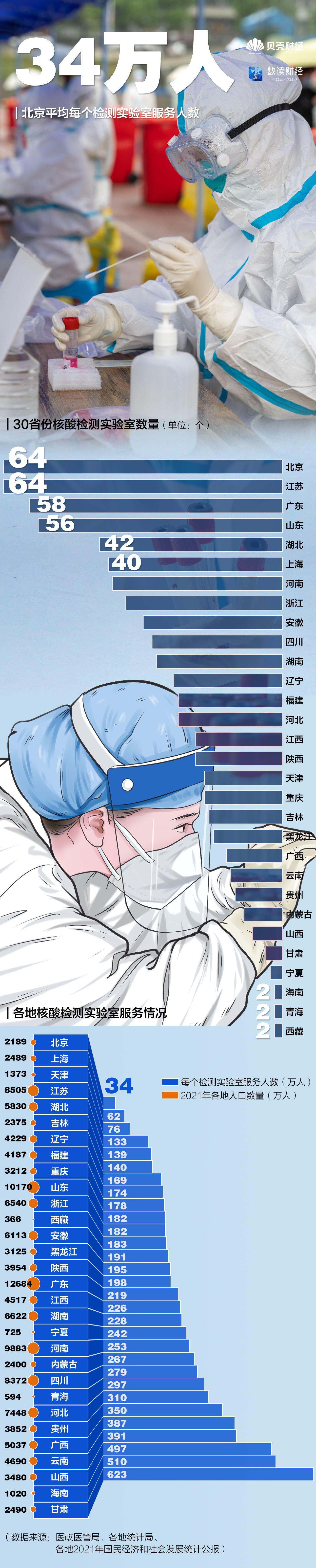 从平均每个核酸检测实验室服务人数来看,北京、上海、天津压力最小。在北京平均每个检测实验室服务34万人,上海、天津均未超过100万人。检测实验室数量最多的江苏,平均每个实验室覆盖133万人。