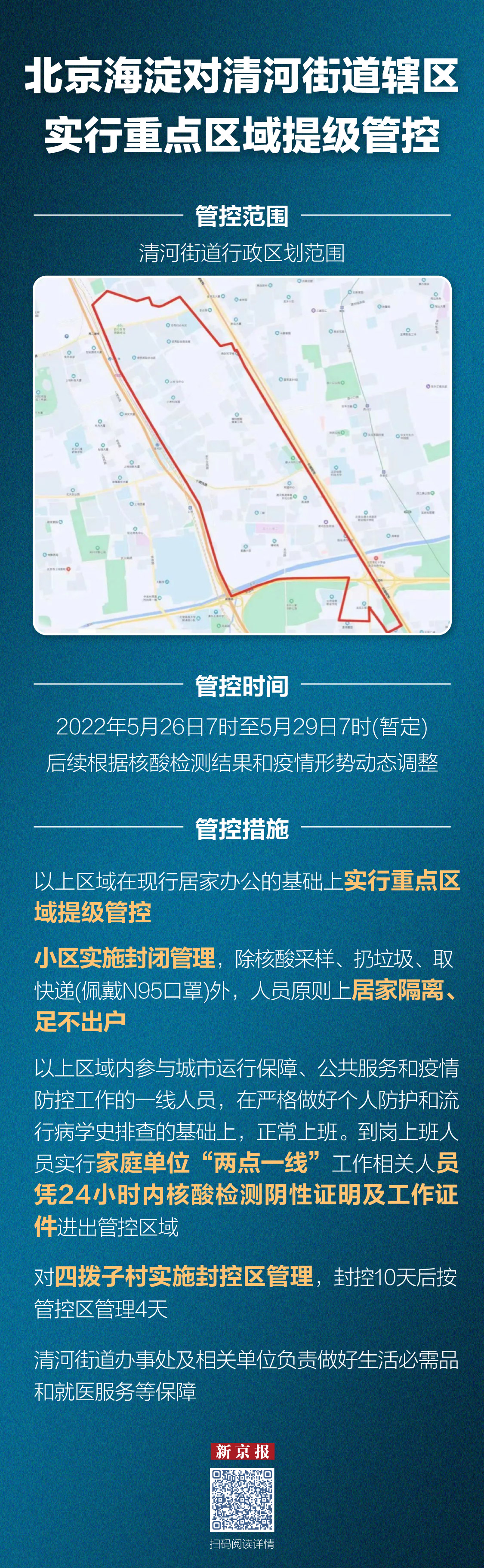 海淀区委常委、宣传部部长肖丹介绍,鉴于该区清河街道辖区出现多例阳性感染者,经疾控部门研判,暂定自5月26日7时至5月29日7时,清河街道行政区划范围内实行重点区域提级管控,后续将根据核酸检测结果和疫情形势动态调整。对四拨子村实施封控区管理,封控10天后,按管控区管理4天。阅读全文>>>