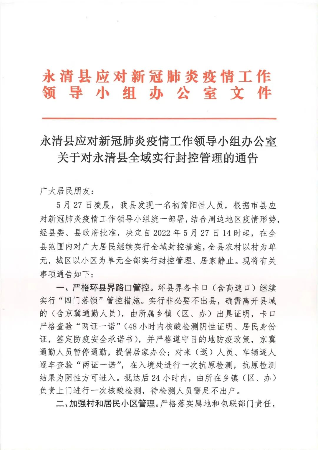 新京报讯 5月27日,河北廊坊永清县发现一名初筛阳性人员,永清县应对新冠肺炎疫情工作领导小组办公室发布关于对永清县全域实行封控管理的通告。全文如下: