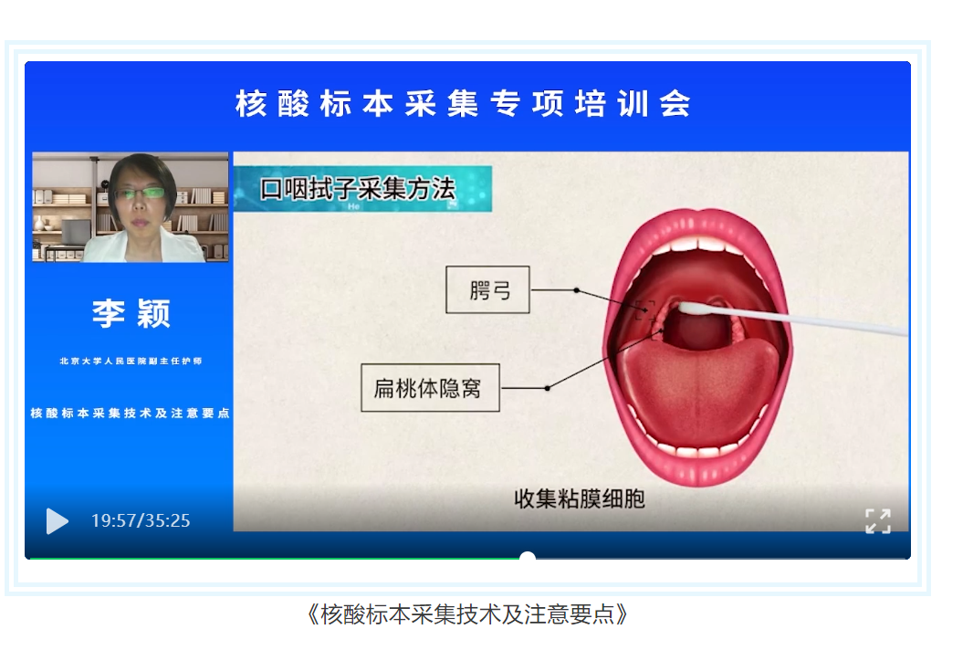 《核酸标本采集技术及注意要点》视频主讲人为北京大学人民医院感染科李颖。在35分钟的视频中,她介绍了采样管选择、口咽拭子采样方法等内容,同时辅助相关视频演示。