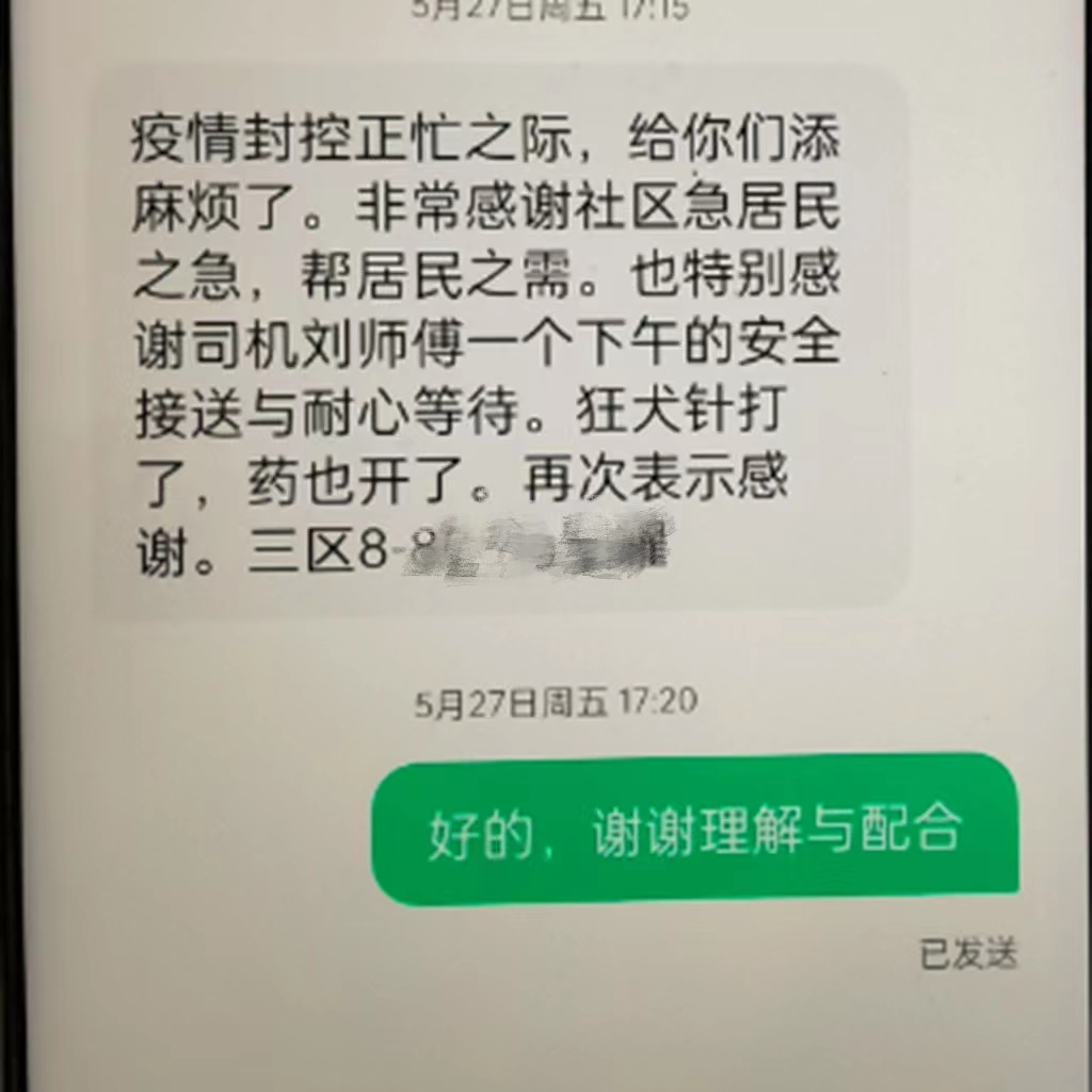 8号楼的“管家”小姜第一天上岗就遇上了紧急情况,一大早,住在8层的居民马先生在“掌上四合院”上联系小姜,需要紧急援助。当天是马先生接种第二针狂犬疫苗的日子,逾期不接种,第一针疫苗就失效了,但医院无法自行接收封控区病人。了解情况后,小姜第一时间向驻组医生汇报情况,经过多番沟通,当天下午将马先生闭环转运至丰台中西医结合医院,顺利接种了疫苗。